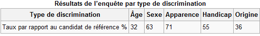Selon une enquête réalisée en novembre 2006 par Jean François Amadieu, le directeur de l'observatoire des discriminations, nous pouvons voir le pourcentage de discrimination à l'embauche en fonction de différents critères :